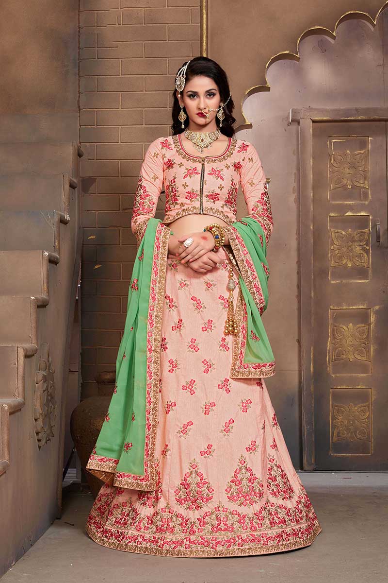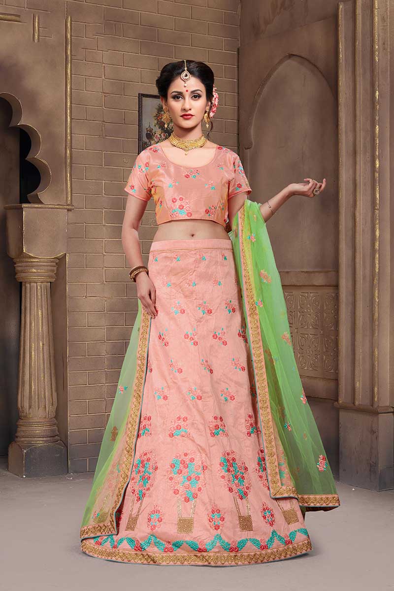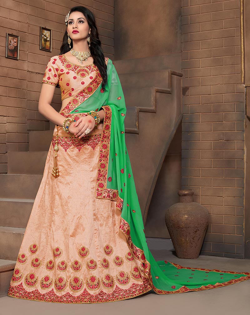 Light Peach Colored Mulberry Silk Lahenga Choli | Order it now via Whatsapp us on +919619659727