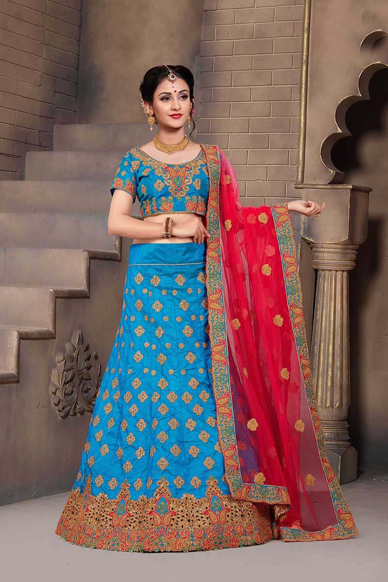 Blue Colored Mulberry Silk Lahenga Choli | Order it now via Whatsapp us on +919619659727