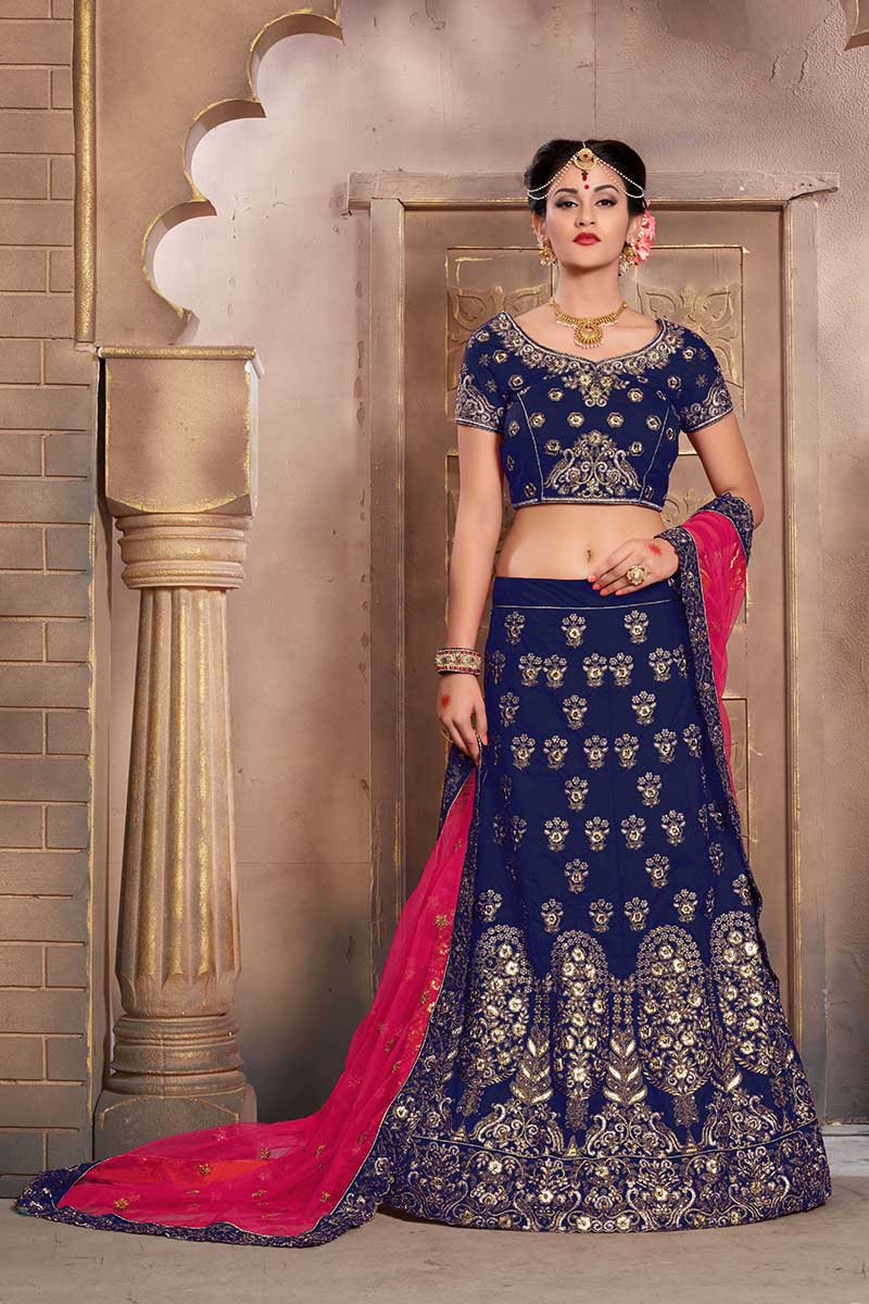 Navy Blue Colored Mulberry Silk Lahenga Choli | Order it now via Whatsapp us on +919619659727