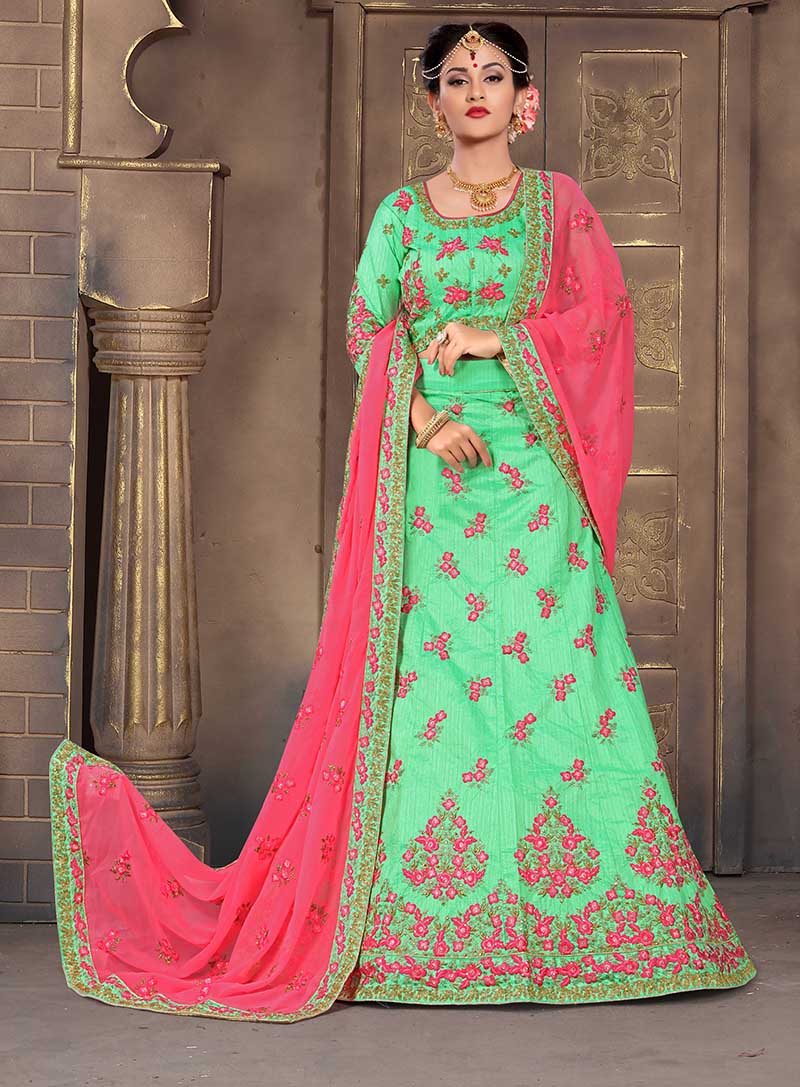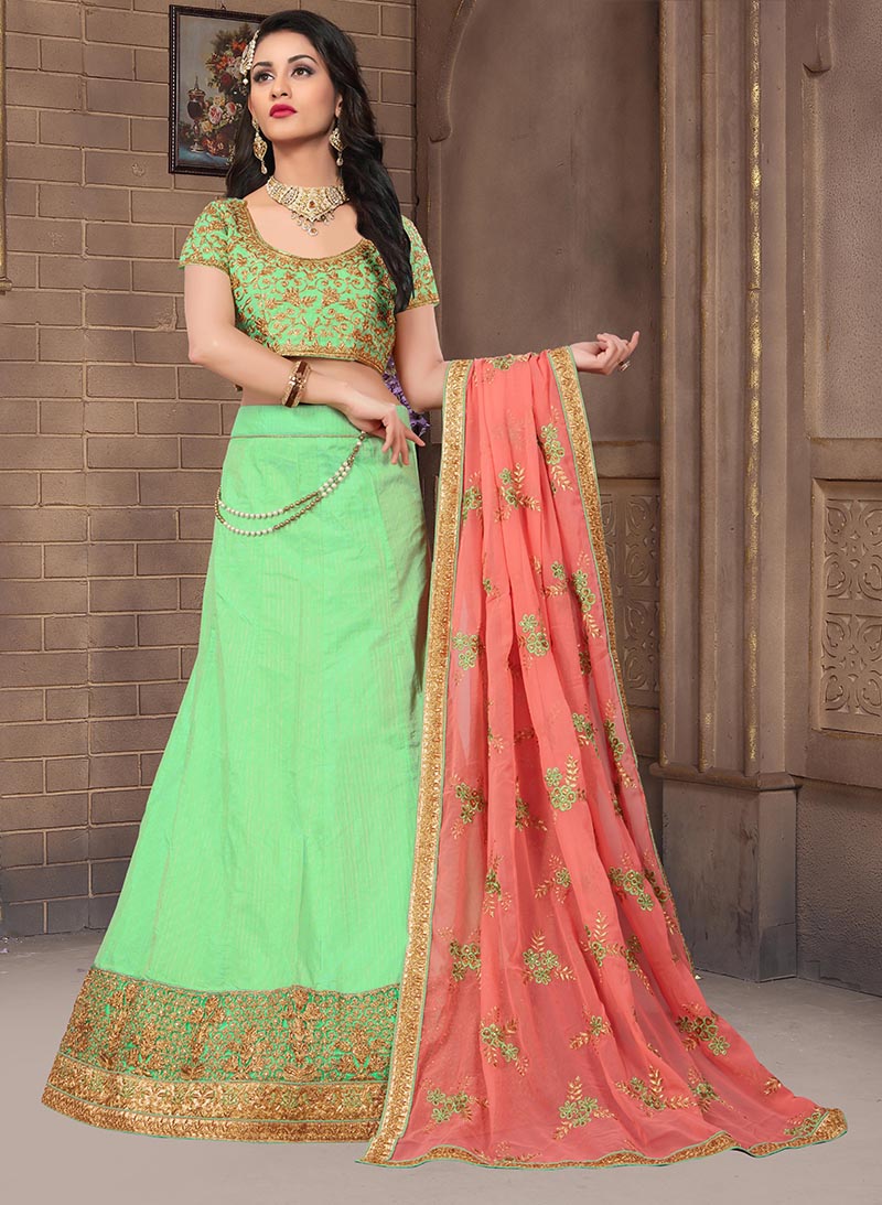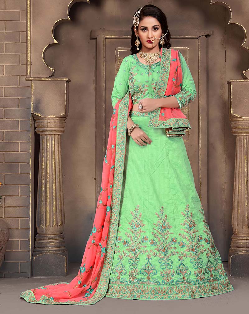 Green Colored Mulberry Silk Lahenga Choli | Order it now via Whatsapp us on +919619659727