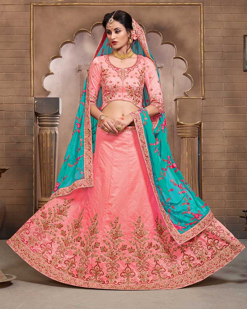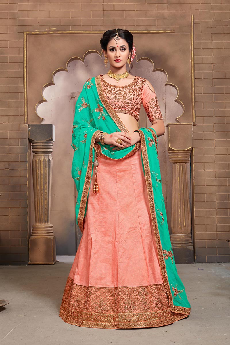 Peach Colored Mulberry Silk Lahenga Choli | Order it now via Whatsapp us on +919619659727