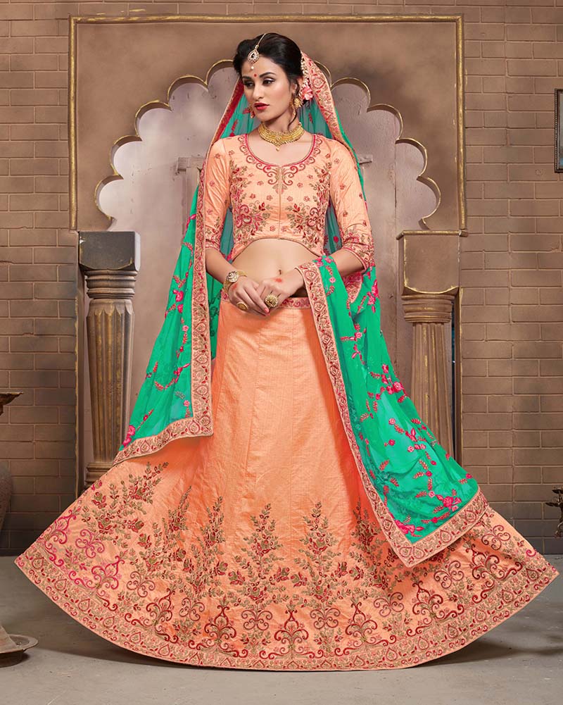 light Orange Colored Mulberry Silk Lahenga Choli | Order it now via Whatsapp us on +919619659727