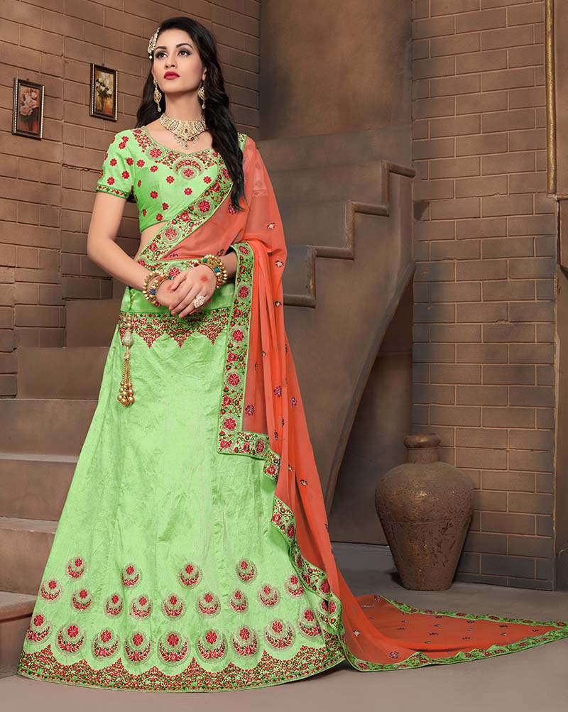 Parrot Green Colored Mulberry Silk Lahenga Choli | Order it now via Whatsapp us on +919619659727