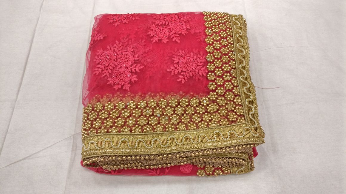 Pink beautiful net designer heavy thread embroidery work party wear saree On heavy pearl work border in all over saree with matching running color embroidery work blouse