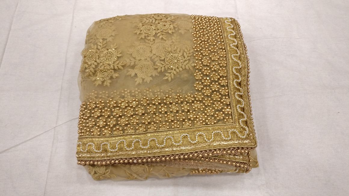 Beige beautiful net designer heavy thread embroidery work party wear saree On heavy pearl work border in all over saree with matching running color embroidery work blouse