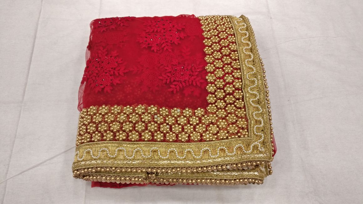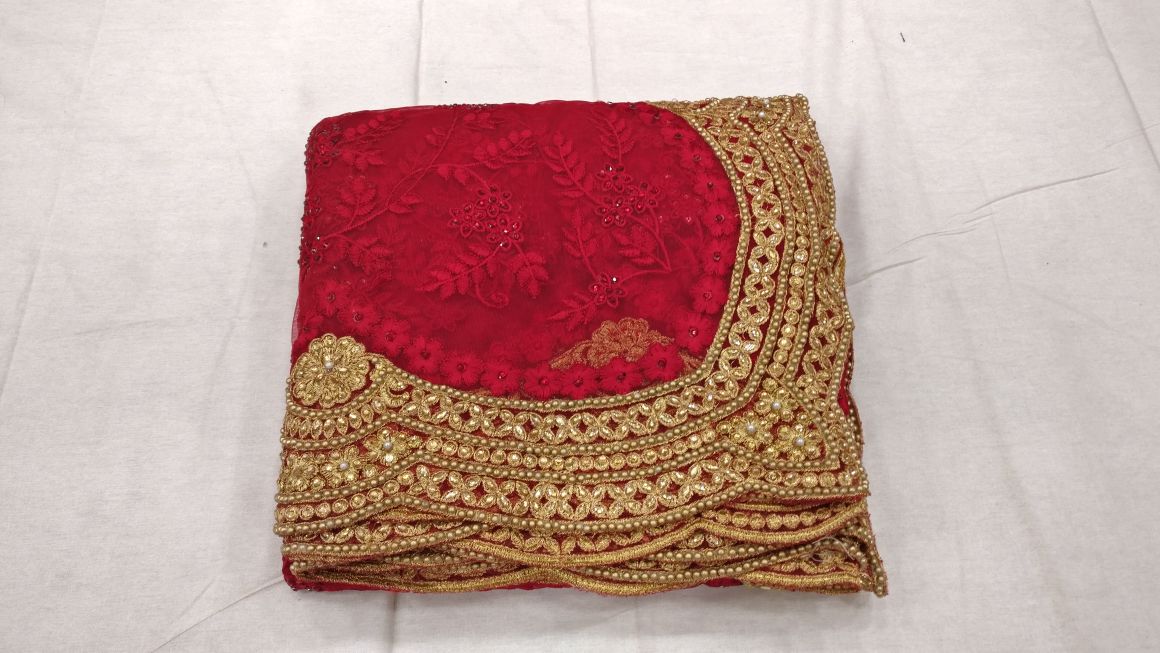 Red beautiful net designer heavy thread embroidery work party wear saree On heavy pearl work border in all over saree with matching running color embroidery work blouse