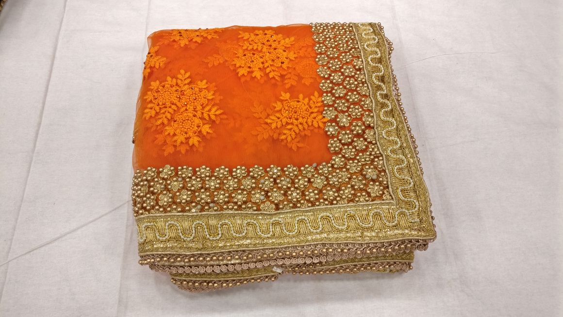 Orange beautiful net designer heavy thread embroidery work party wear saree On heavy pearl work border in all over saree with matching running color embroidery work blouse
