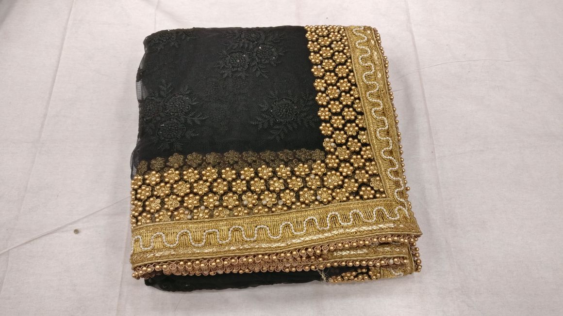 Black beautiful net designer heavy thread embroidery work party wear saree On heavy pearl work border in all over saree with matching running color embroidery work blouse