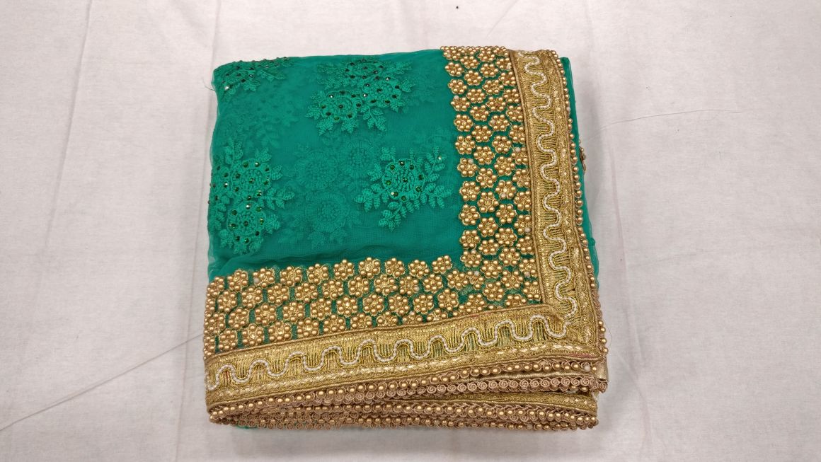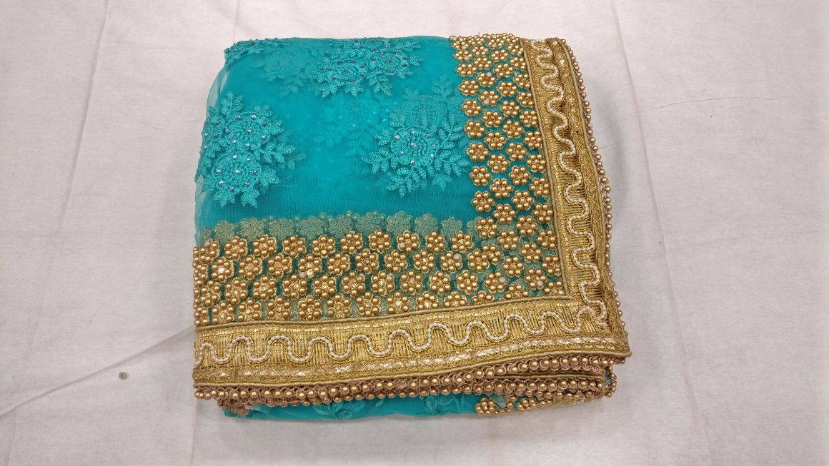 Green beautiful net designer heavy thread embroidery work party wear saree On heavy pearl work border in all over saree with matching running color embroidery work blouse