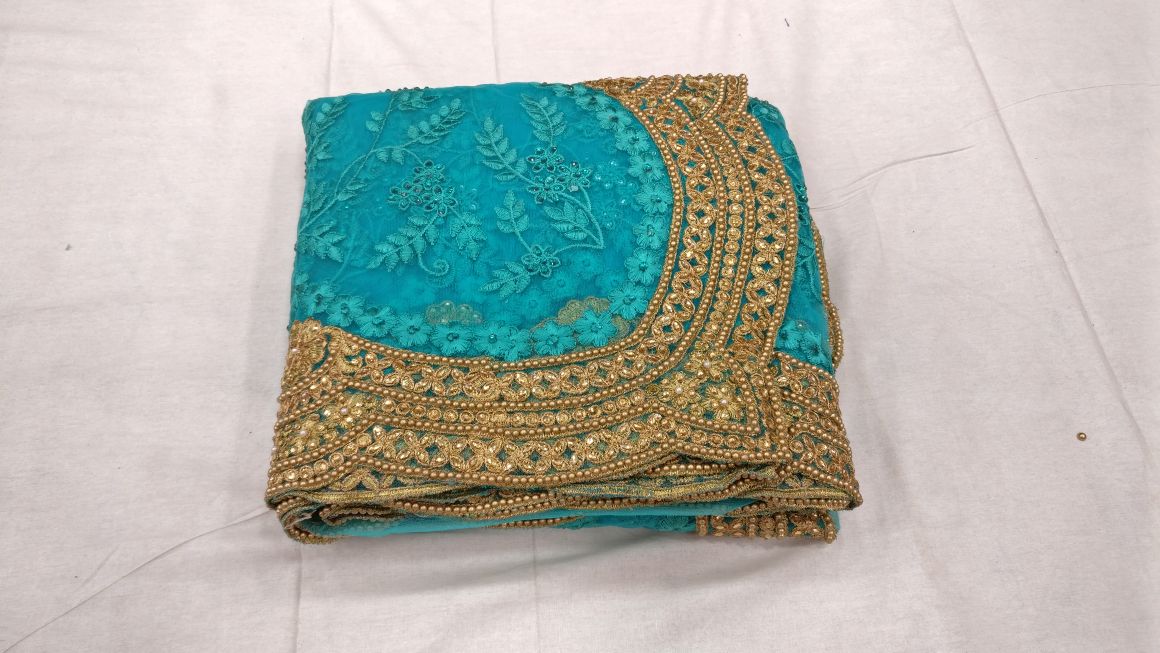 Blue beautiful net designer heavy thread embroidery work party wear saree On heavy pearl work border in all over saree with matching running color embroidery work blouse