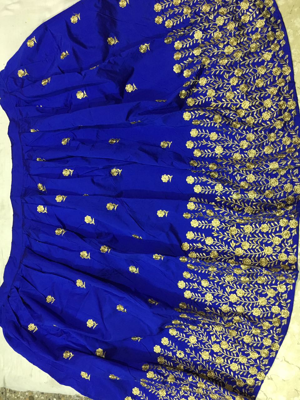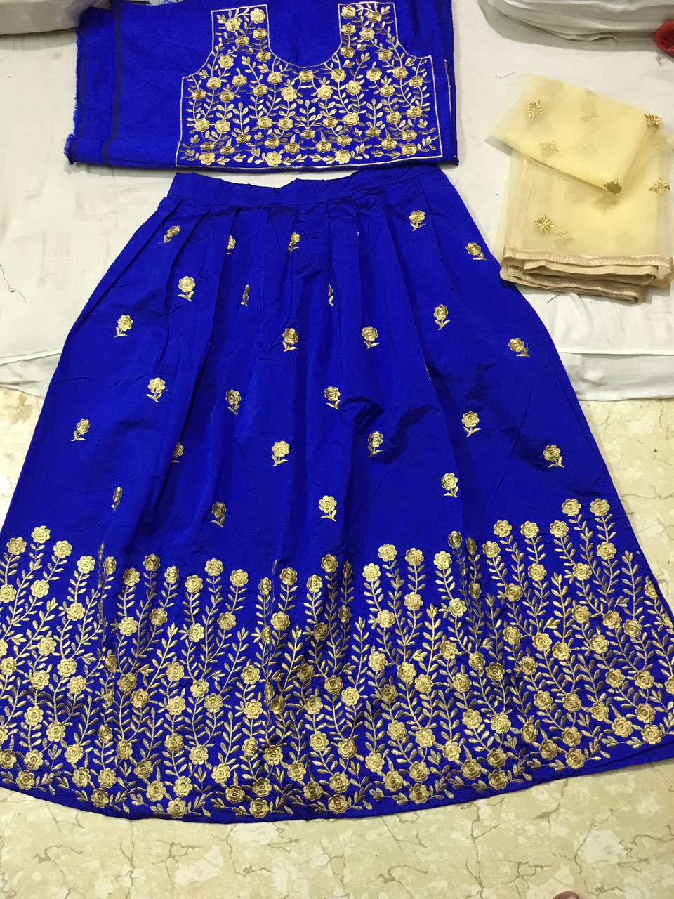 The Royal Blue Taffeta silk lehenga blouse set is adorned with all-over floral machine embroidery. It is paired with Chikoo color net embroidered dupatta edged with lace border. You can get this outfit for you as well. Order Now!