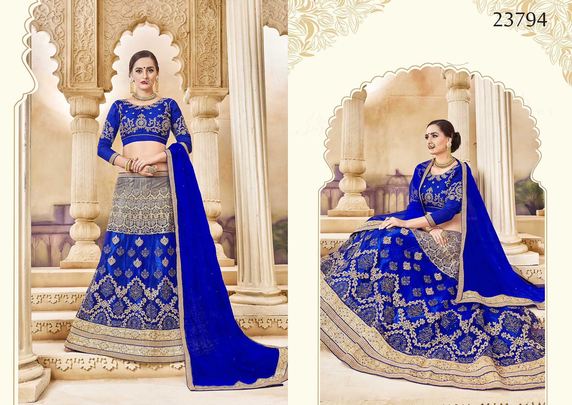 Look mesmeric and hypnotize many men by wearing this gorgeous colored lehenga set. You will feel utmost comfort wearing this banglori silk set and the beauty it will lend to you will be eternal. Flaunt it at the next wedding function, complemented by a pair of stunning danglers.