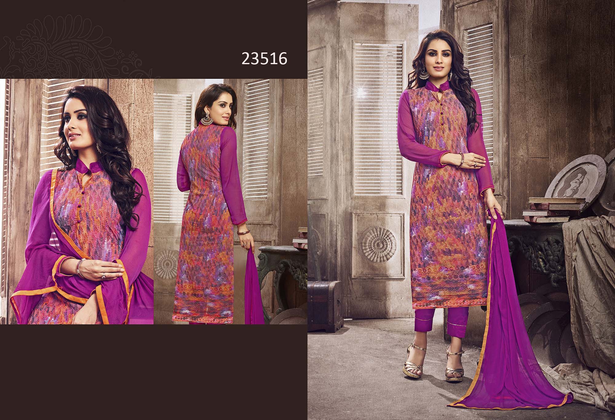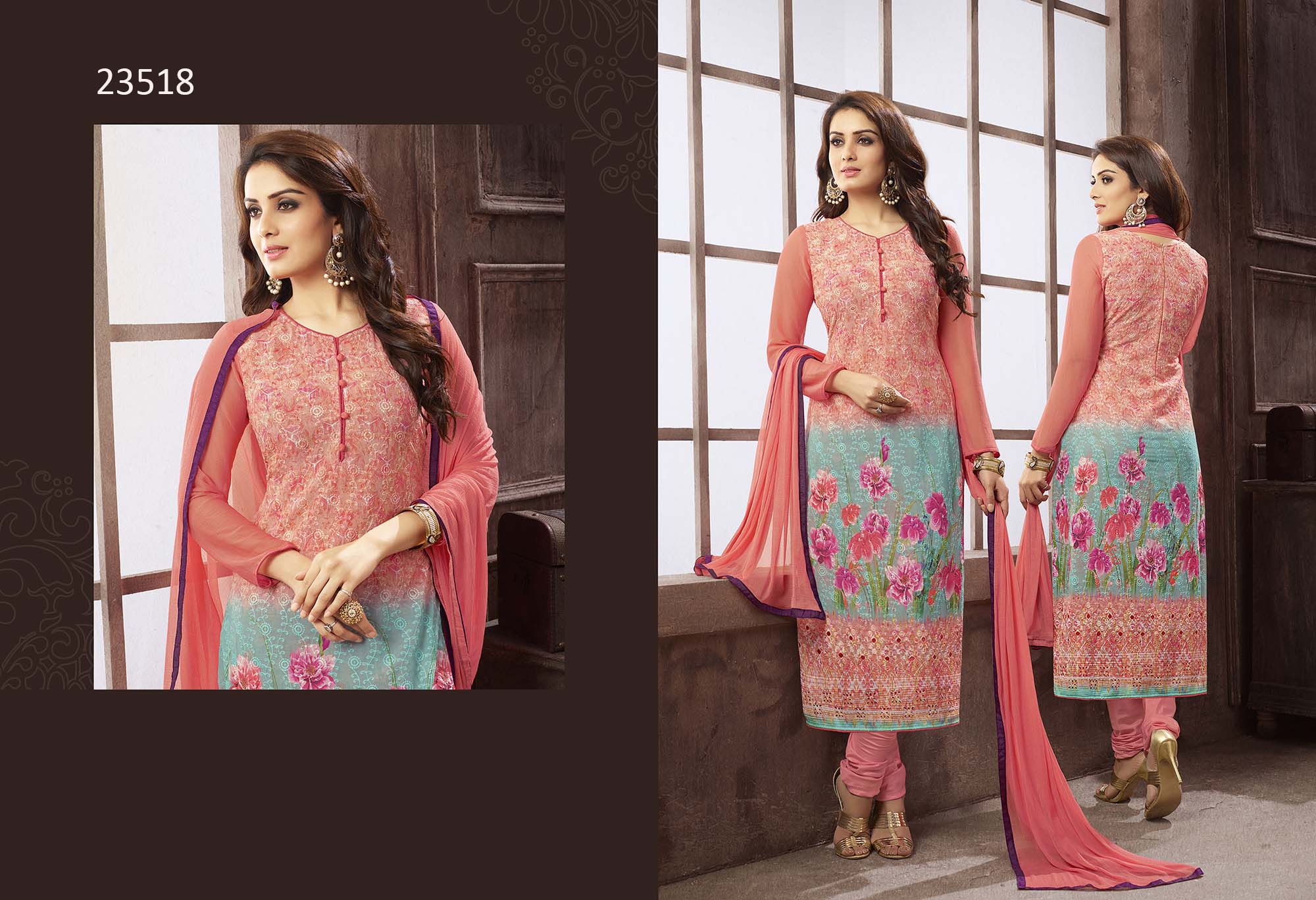 If those readymade suits don’t lend you the desired fit, then these dress material will surely please you. These printed dress material will catch your fancy at once. Made from georgette, these dress materials are worthy to have part of your daily wear.