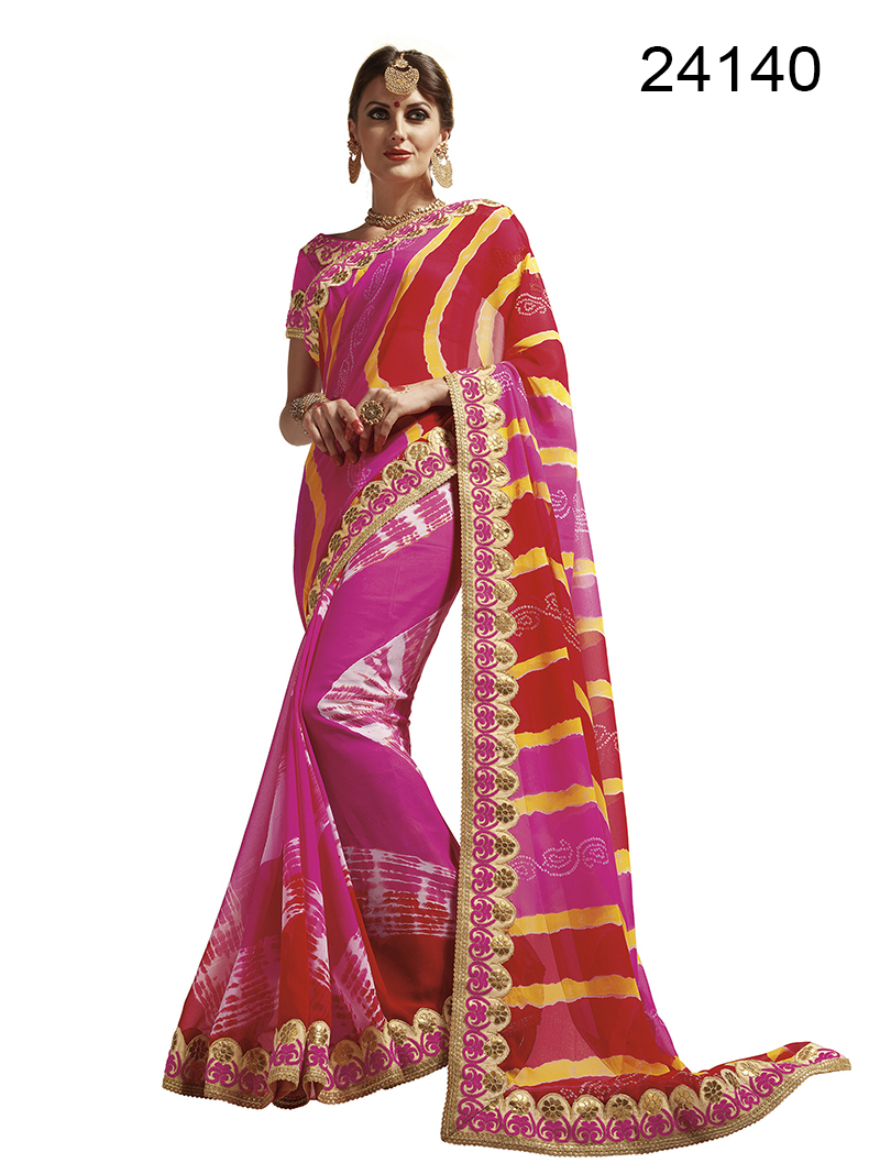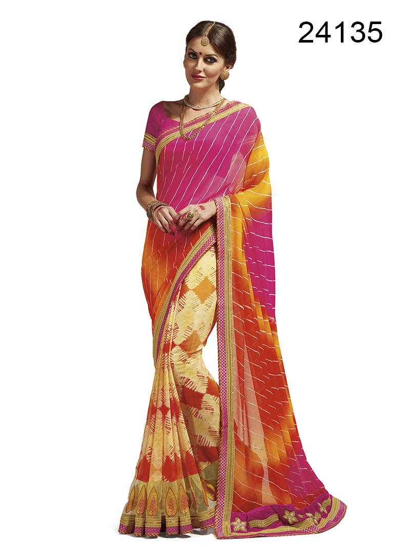 Most women will be able to pull off these sarees with a lot of oomph and glamour. If it’s attractive print is enough to grab your attention fully, then it’s soft and flowy georgette fabric will do the trick. Also, it will be easy to drape and carry. Team it with a gorgeous pair of gold colored danglers. This saree measures 5.50m and comes with a 0.80m blouse piece.