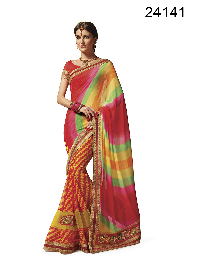 Most women will be able to pull off these sarees with a lot of oomph and glamour. If it’s attractive print is enough to grab your attention fully, then it’s soft and flowy georgette fabric will do the trick. Also, it will be easy to drape and carry. Team it with a gorgeous pair of gold colored danglers. This saree measures 5.50m and comes with a 0.80m blouse piece.
