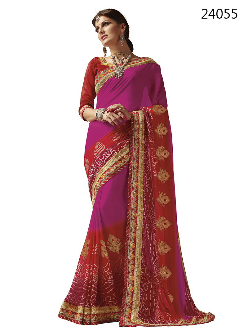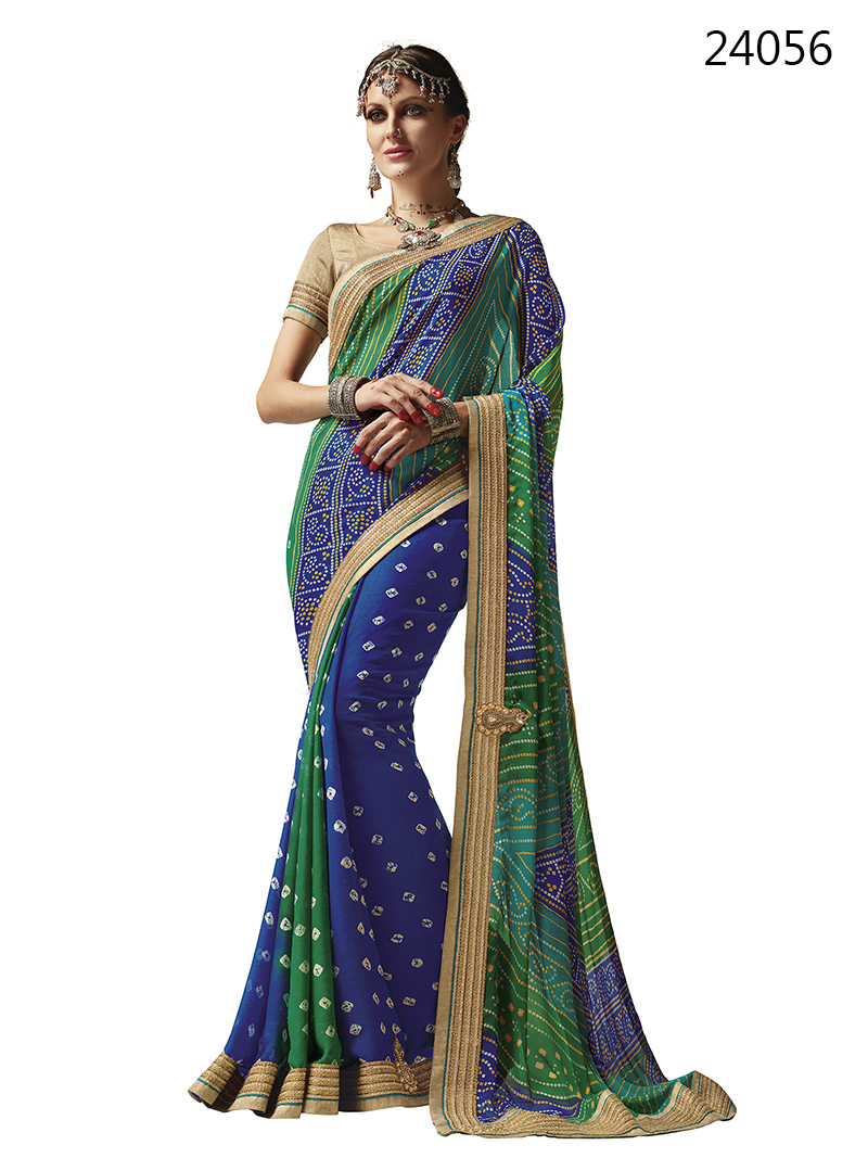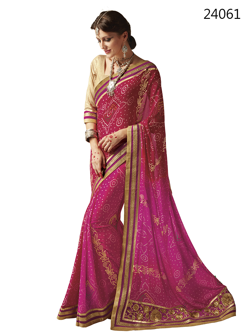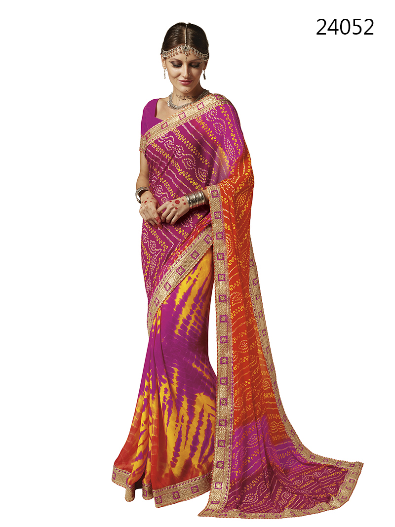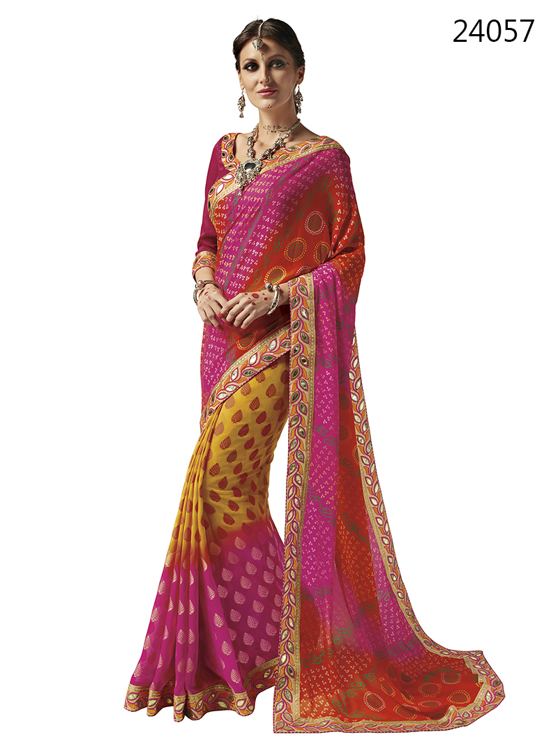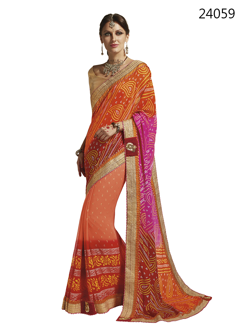 Drape these Bandhej sarees and look pretty like never before. This beautiful saree features a classy bandhani print all over, which makes it a smart pick for festive occasions. Made from georgette, this 5.5 m saree is light in weight and easy to carry all day long. It comes with a 0.80 m blouse piece.